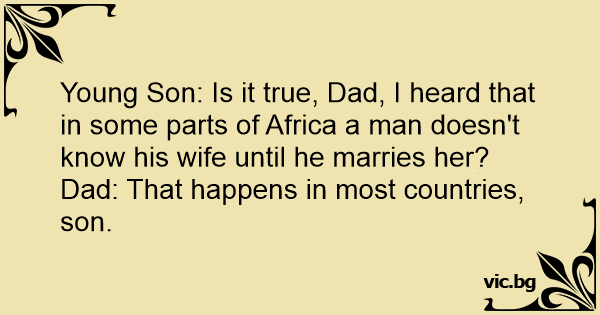 Синот го прашува таткото: Вистина ли е дека во некои области на Африка мажот не ја познава жената сè додека не ја ожени? Таткото: Така ти е тоа, сине мој, во сите земји.