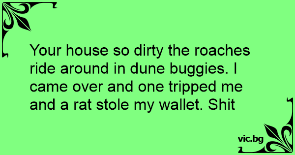 Your house so dirтy the roaches ride around in dune buggies. I came over and one tripped me and a rat stole my wallet. Shit
