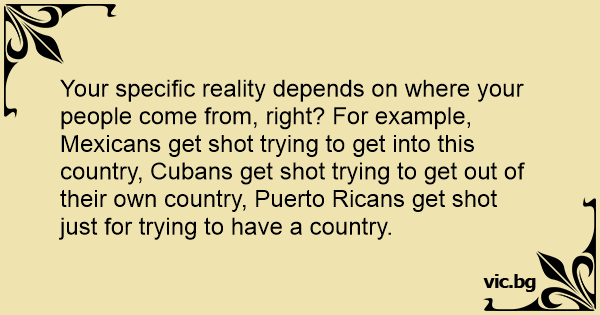 Your specific reality depends on where your people come from, right? For example, Mexicans get shot trying to get into this country, Cubans get shot trying to get out of their own country, Puerto Ricans get shot just for trying to have a country.