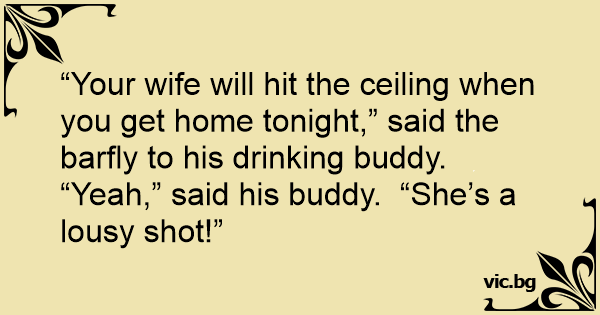 “Your wife will hit the ceiling when you get home tonight,” said the barfly to his drinking buddy. “Yeah,” said his buddy. “She’s a lousy shot!”