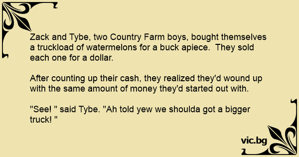 Zack and Tybe, two Country Farm boys, bought themselves a truckload of watermelons for a buck apiece. They sold each one for a dollar.