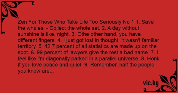 Zen For Those Who Take Life Too Seriously No 1 1. Save the whales. - Collect the whole set. 2. A day without sunshine is like, night. 3. Othe other hand, you have different fingers. 4. I just got lost in thought. it wasn't familiar territory. 5. 42.7 percent of all statistics are made up on the spot. 6. 99 percent of lawyers give the rest a bad name. 7. I feel like I'm diagonally parked in a parallel universe. 8. Honk if you love peace and quiet. 9. Remember, half the people you know are below average. 10. He who laughs last, thinks slowest. 11. Depression is merely anger without enthusiasm. 12. The early bird may get the worm, but the second mouse gets the cheese. 13. I drive way too fast to worry about cholesterol. 14. Support bacteria. they're the only culture some people have. 15. Monday is an awful way to spend 1/7 of your week. 16. A clear conscience is usually the sign of a bad memory. 17. Change is inevitable, except from vending machines 18. Get a new car for your spouse. it'll be a great trade! 19. Plan to be spontaneous tomorrow. Continued tomorrow...