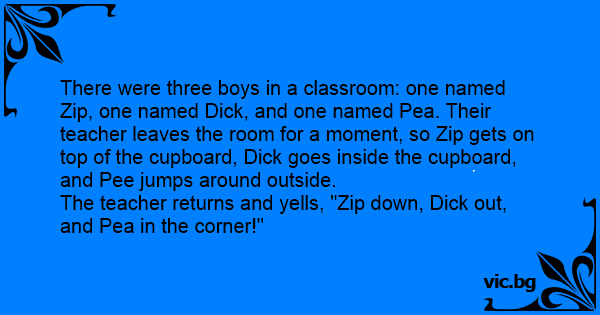 The teacher returns and yells, "Zip down, Diск out, and Pea in the corner!"
