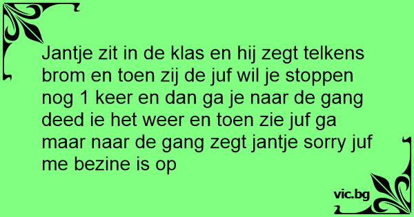 Jantje zit in de klas en hij zegt telkens brom en toen zij de juf wil je stoppen nog 1 keer en dan ga je naar de gang deed ie het weer en toen zie juf ga maar naar de gang zegt jantje sorry juf me bezine is op