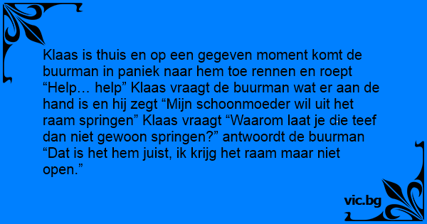 Klaas is thuis en op een gegeven moment komt de buurman in paniek naar hem toe rennen en roept “Help… help” Klaas vraagt de buurman wat er aan de hand is en hij zegt “Mijn schoonmoeder wil uit het raam springen” Klaas vraagt “Waarom laat je die тееf dan niet gewoon springen?” antwoordt de buurman “Dat is het hem juist, ik krijg het raam maar niet open.”
