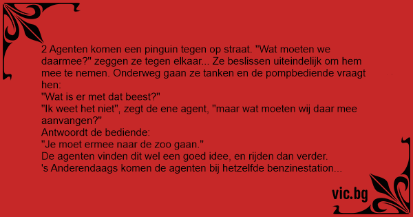 's Anderendaags komen de agenten bij hetzelfde benzinestation tanken. Tot de verbazing van de pompbediende ziet hij die pinguïn opnieuw in de combi zitten. "Awel," zegt de man, "zijn jullie er dan niet mee naar de zoo geweest?"