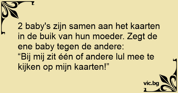 2 baby's zijn samen aan het kaarten in de buik van hun moeder. Zegt de ene baby tegen de andere: