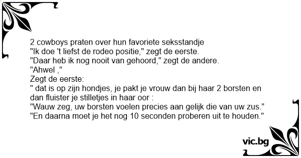 "Ik doe 't liefst de rodeo positie," zegt de eerste.