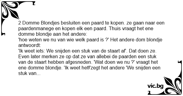 'Ik weet iets: We snijden een stuk van de staart af'. Dat doen ze. Even later merken ze op dat ze van allebei de paarden een stuk van de staart hebben afgesneden. 'Wat doen we nu ?' vraagt het ene domme blondje. 'Ik weet het!'zegt het andere 'We snijden een stuk van het oor af!' Even later merken ze opnieuw op dat ze van allebei de paarden een stuk van het oor hebben afgesneden. 'Wat nu gedaan ?' zegt het ene domme blondje. Waarop het andere antwoordt: