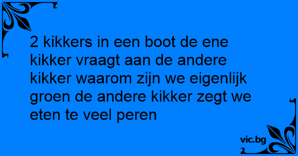 2 kikkers in een boot de ene kikker vraagt aan de andere kikker waarom zijn we eigenlijk groen de andere kikker zegt we eten te veel peren