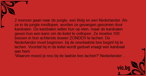 2 mensen gaan naar de jungle, een Belg en een Nederlander. Als ze in de jungle rondlopen, worden ze gevangen genomen door kanibalen. De kanibalen willen hun op eten, maar de kanibalen geven hun een kans om de ketel te ontlopen. Ze moeten 100 bessen in hun achterste duwen ZONDER te lachen. De Nederlander moet beginnen. bij de enerlaatste bes begint hij te lachen. Voordat hij in de ketel wordt geduwt vraagt een kanibaal aan hem: