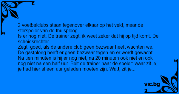De gastploeg heeft er geen bezwaar tegen en er wordt gewacht. Na tien minuten is hij er nog niet, na 20 minuten ook niet en ook nog niet na een half uur. Belt de trainer naar de speler: waar zit je, je had hier al een uur geleden moeten zijn. Wat!, zit je nog thuis, hое komt dat? Hoezo het is mijn schuld!