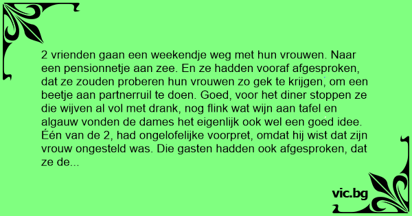2 vrienden gaan een weekendje weg met hun vrouwen. Naar een pensionnetje aan zee. En ze hadden vooraf afgesproken, dat ze zouden proberen hun vrouwen zo gek te krijgen, om een beetje aan partnerruil te doen. Goed, voor het diner stoppen ze die wijven al vol met drank, nog flink wat wijn aan tafel en algauw vonden de dames het eigenlijk ook wel een goed idee.