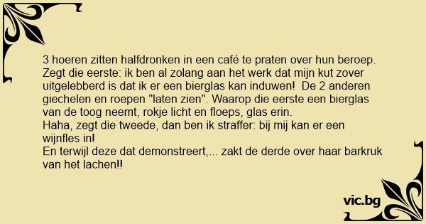 Zegt die eerste: ik ben al zolang aan het werk dat mijn кuт zover uitgelebberd is dat ik er een bierglas kan induwen! De 2 anderen giechelen en roepen "laten zien". Waarop die eerste een bierglas van de toog neemt, rokje licht en floeps, glas erin.