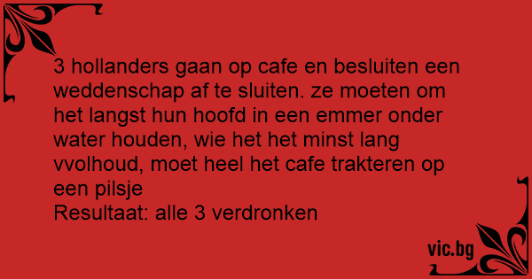 3 hollanders gaan op cafe en besluiten een weddenschap af te sluiten. ze moeten om het langst hun hoofd in een emmer onder water houden, wie het het minst lang vvolhoud, moet heel het cafe trakteren op een pilsje