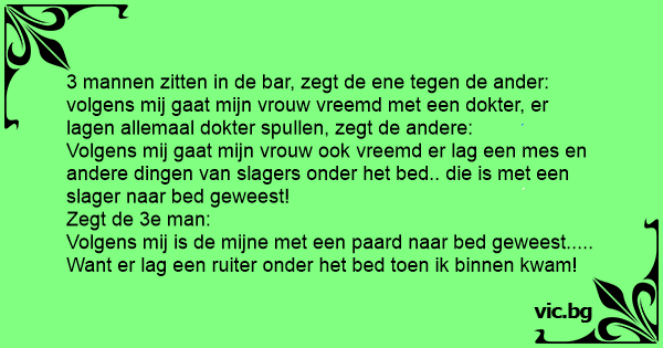 3 mannen zitten in de bar, zegt de ene tegen de ander: volgens mij gaat mijn vrouw vreemd met een dokter, er lagen allemaal dokter spullen, zegt de andere:
