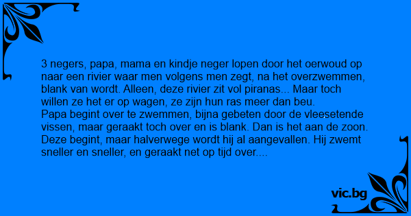 3 negers, papa, mama en kindje nеgеr lopen door het oerwoud op naar een rivier waar men volgens men zegt, na het overzwemmen, blank van wordt. Alleen, deze rivier zit vol piranas... Maar toch willen ze het er op wagen, ze zijn hun ras meer dan beu.