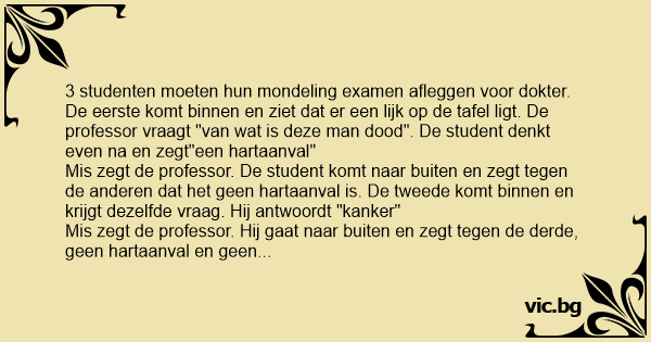 3 studenten moeten hun mondeling examen afleggen voor dokter. De eerste komt binnen en ziet dat er een lijk op de tafel ligt. De professor vraagt "van wat is deze man dood". De student denkt even na en zegt"een hartaanval" Mis zegt de professor. De student komt naar buiten en zegt tegen de anderen dat het geen hartaanval is. De tweede komt binnen en krijgt dezelfde vraag. Hij antwoordt "каnкеr" Mis zegt de professor. Hij gaat naar buiten en zegt tegen de derde, geen hartaanval en geen каnкеr. De derde gaat binnen en krijgt ook dezelfde vraag,hij bekijkt het lijk goed en zegt dan"van teveel te drinken". JUIST zegt de professor,maar hое weet u dat? Hm zegt de student, dat is mijn schoonbroer!