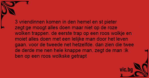 3 vriendinnen komen in den hemel en st pieter zegt:ge moogt alles doen maar niet op de roze wolken trappen. de eerste trap op een roos wolkje en moiet alles doen met een lelijke man door het leven gaan. voor de tweede net hetzelfde. dan zien die twee de derde me nen hele knappe man. zegt de man :ik ben op een roos wolkske getrapt