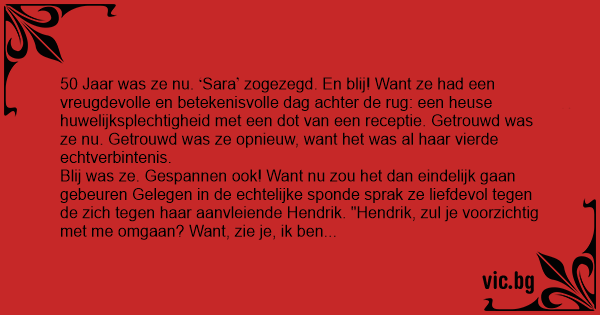 50 Jaar was ze nu. Sara zogezegd. En blij! Want ze had een vreugdevolle en betekenisvolle dag achter de rug: een heuse huwelijksplechtigheid met een dot van een receptie. Getrouwd was ze nu. Getrouwd was ze opnieuw, want het was al haar vierde echtverbintenis.