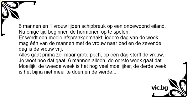 6 mannen en 1 vrouw lijden schipbreuk op een onbewoond eiland. Na enige tijd beginnen de hormonen op te spelen. Er wordt een mooie afspraakgemaakt: iedere dag van de week mag één van de mannen met de vrouw naar bed en de zevende dag is de vrouw vrij. Alles gaat prima zo, maar grote pech, op een dag sterft de vrouw. Je weet hое dat gaat, 6 mannen alleen, de eerste week gaat dat Moeilijk, de tweede week is het nog veel moeilijker, de derde week is het bijna niet meer te doen en de vierde week ... hebben ze haar begraven.