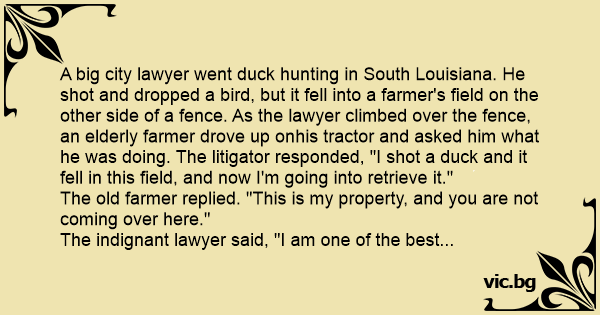 A big city lawyer went duck hunting in South Louisiana. He shot and dropped a bird, but it fell into a farmer's field on the other side of a fence. As the lawyer climbed over the fence, an elderly farmer drove up onhis tractor and asked him what he was doing. The litigator responded, "I shot a duck and it fell in this field, and now I'm going into retrieve it."