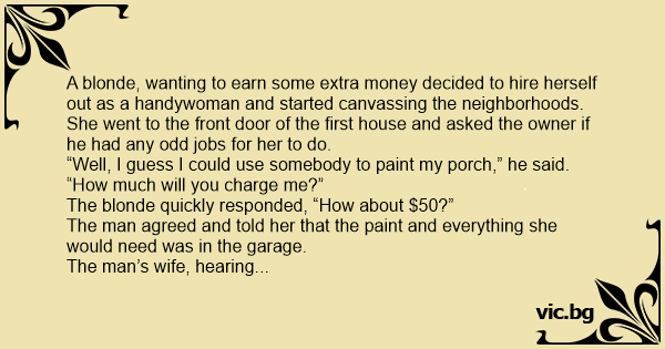 A blonde, wanting to earn some extra money decided to hire herself out as a handywoman and started canvassing the neighborhoods. She went to the front door of the first house and asked the owner if he had any odd jobs for her to do.