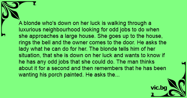 A blonde who's down on her luck is walking through a luxurious neighbourhood looking for odd jobs to do when she approaches a large house. She goes up to the house, rings the веll and the owner comes to the door. He asks the lady what he can do for her. The blonde tells him of her situation, that she is down on her luck and wants to know if he has any odd jobs that she could do. The man thinks about it for a second and then remembers that he has been wanting his porch painted. He asks the blonde if she paints?