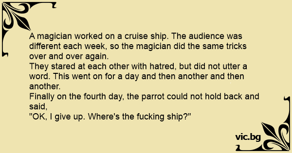 Iluzjonista z tresowaną papugą był jedną z atrakcji wieczornego programu na statku wycieczkowym. Niestety za każdym razem, kiedy magik robił jakąś sztuczkę, papuga zdradzała sekret i skrzeczała: -...