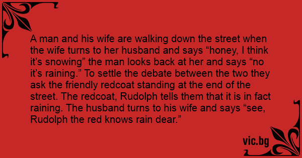 A man and his wife are walking down the street when the wife turns to her husband and says “honey, I think it’s snowing” the man looks back at her and says “no it’s raining.” To settle the debate between the two they ask the friendly redcoat standing at the end of the street. The redcoat, Rudolph tells them that it is in fact raining. The husband turns to his wife and says “see, Rudolph the red knows rain dear.”