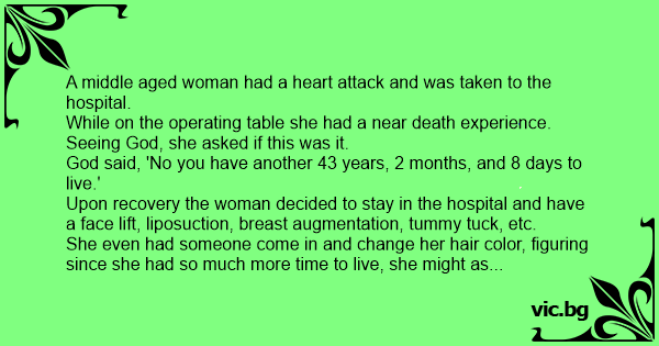 Eine mittelalte Frau hatte einen Herzanfall und wurde zum Spital gebracht. Wie sie am Operationstisch lag, hatte sie eine "Todesnahe Erfahrung". Sie sieht Gott und fragt ihn: "Ist mein Leben aus?" Gott sagt: "Nein, du hast noch 43 Jahre, 2 Monate und 8 Tage zum Leben." Nach der Herzoperation...