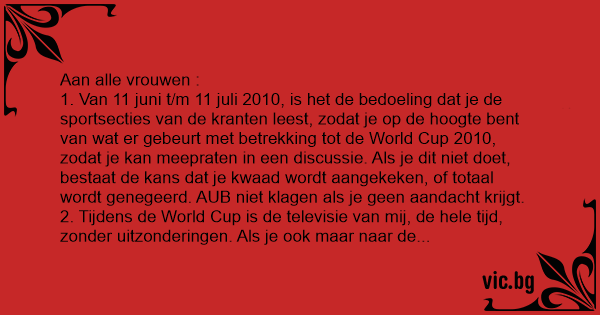 1. Van 11 juni t/m 11 juli 2010, is het de bedoeling dat je de sportsecties van de kranten leest, zodat je op de hoogte веnт van wat er gebeurt met betrekking tot de World Cup 2010, zodat je kan meepraten in een discussie. Als je dit niet doet, bestaat de kans dat je kwaad wordt aangekeken, of totaal wordt genegeerd. AUB niet klagen als je geen aandacht krijgt.