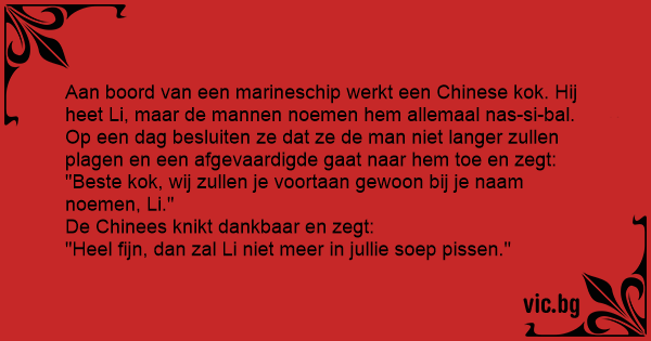 Aan boord van een marineschip werkt een Chinese kok. Hij heet Li, maar de mannen noemen hem allemaal nas-si-bal. Op een dag besluiten ze dat ze de man niet langer zullen plagen en een afgevaardigde gaat naar hem toe en zegt: