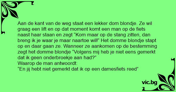 Aan de kant van de weg staat een lekker dom blondje. Ze wil graag een lift en op dat moment komt een man op de fiets naast haar staan en zegt “Kom maar op de stang zitten, dan breng ik je waar je maar naartoe wil!” Het domme blondje stapt op en daar gaan ze. Wanneer ze aankomen op de bestemming zegt het domme blondje “Volgens mij heb je niet eens gemerkt dat ik geen onderbroekje aan had?”