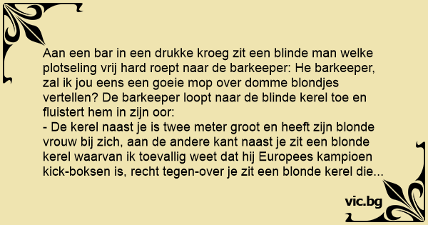 En blind mann i en bar roper til bartenderen: - ”Vil du høre en blondinevits?” Mannen ved siden av ham lener seg bort og hvisker: - ”Før du forteller den vitsen er det noe du bør vite. Bartenderen...