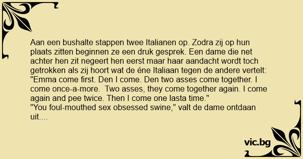 Aan een bushalte stappen twee Italianen op. Zodra zij op hun plaats zitten beginnen ze een druk gesprek. Een dame die net achter hen zit negeert hen eerst maar haar aandacht wordt toch getrokken als zij hoort wat de éne Italiaan tegen de andere vertelt: