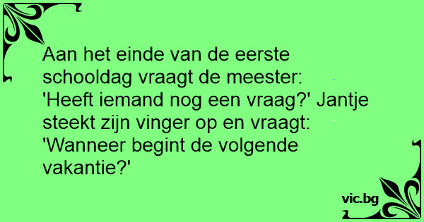 Aan het einde van de eerste schooldag vraagt de meester: 'Heeft iemand nog een vraag?' Jantje steekt zijn vinger op en vraagt: 'Wanneer begint de volgende vakantie?'