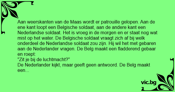 Aan weerskanten van de Maas wordt er patrouille gelopen. Aan de ene kant loopt een Belgische soldaat, aan de andere kant een Nederlandse soldaat. Het is vroeg in de morgen en er staat nog wat мisт op het water. De Belgische soldaat vraagt zich af bij welk onderdeel de Nederlandse soldaat zou zijn. Hij wil het met gebaren aan de Nederlander vragen. De Belg maakt een fladderend gebaar en roept: