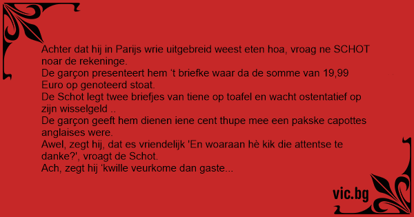 Achter dat hij in Parijs wrie uitgebreid weest eten hoa, vroag ne SCHOT noar de rekeninge.