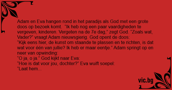Adam en Eva staan samen met god te praten dan vraagt god: Wie wil er staant kunnen plassen? Adam: Ik Ik! God: Dan krijgt Eva het meervoudige orgasme.
