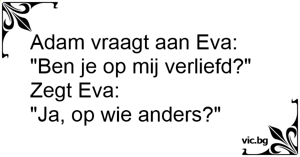 Eva en Adam liggen in de zon . Opeens vraagt Eva aan Adam: Zeg adam, houde gij eigenlijk nog van mij??? Natuurlijk zegt Adam met een teleurgesteld gezicht en hij zegt: Ja duuh stoem wijf, van wie...
