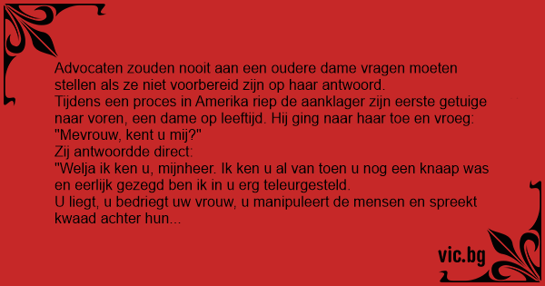 Tijdens een proces in Amerika riep de aanklager zijn eerste getuige naar voren, een dame op leeftijd. Hij ging naar haar toe en vroeg: