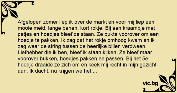Afgelopen zomer liep ik over de markt en voor mij liep een mooie meid, lange benen, kort rokje. Bij een kraampje met petjes en hoedjes bleef ze staan. Ze bukte voorover om een hoedje te pakken. Ik zag dat het rokje omhoog kwam en ik zag waar de string tussen de heerlijke billen verdween.