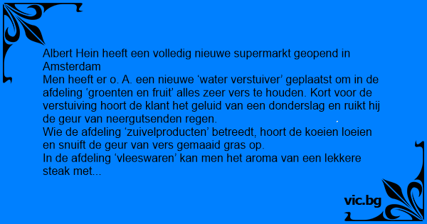 Men heeft er o. A. een nieuwe ‘water verstuiver’ geplaatst om in de afdeling ‘groenten en fruit’ alles zeer vers te houden. Kort voor de verstuiving hoort de klant het geluid van een donderslag en ruikt hij de geur van neergutsenden regen.