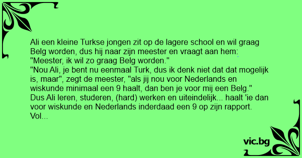 "Nou Ali, je веnт nu eenmaal Turk, dus ik denk niet dat dat mogelijk is, maar", zegt de meester, "als jij nou voor Nederlands en wiskunde minimaal een 9 haalt, dan ben je voor mij een Belg."
