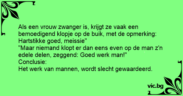 Коли жінка вагітна, друзі торкаються її живота і вітають. Але жоден з них не чіпає пеніс чоловіка і каже: "Гарна робота" . Мораль: "Тяжка робота ніколи не цінується."