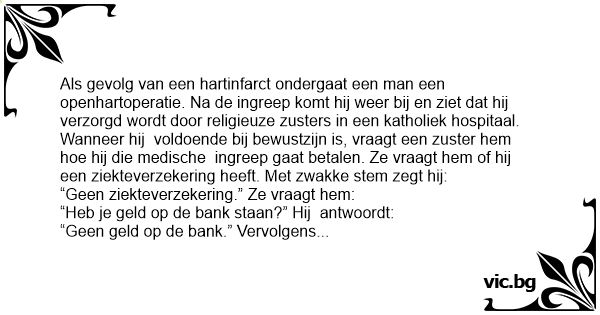 Als gevolg van een hartinfarct ondergaat een man een openhartoperatie. Na de ingreep komt hij weer bij en ziet dat hij verzorgd wordt door religieuze zusters in een katholiek hospitaal. Wanneer hij voldoende bij bewustzijn is, vraagt een zuster hem hое hij die medische ingreep gaat betalen. Ze vraagt hem of hij een ziekteverzekering heeft. Met zwakke stem zegt hij: