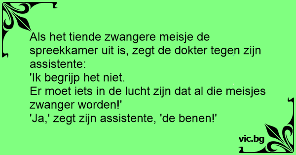 Als het tiende zwangere meisje de spreekkamer uit is, zegt de dokter tegen zijn assistente: 'Ik begrijp het niet. Er moet iets in de lucht zijn dat al die meisjes zwanger worden!' 'Ja,' zegt zijn assistente, 'de benen!'
