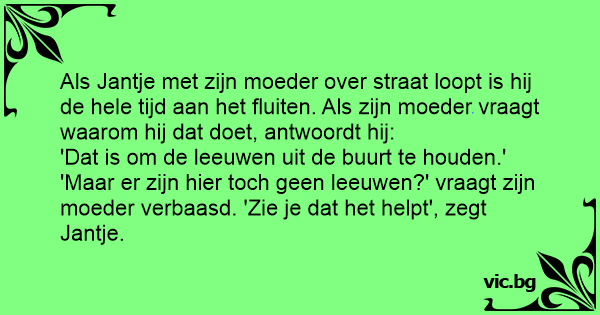 'Maar er zijn hier toch geen leeuwen?' vraagt zijn moeder verbaasd. 'Zie je dat het helpt', zegt Jantje.