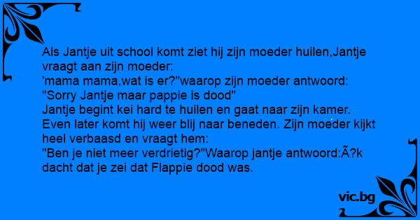 "Ben je niet meer verdrietig?"Waarop jantje antwoord:Ã?k dacht dat je zei dat Flappie dood was.